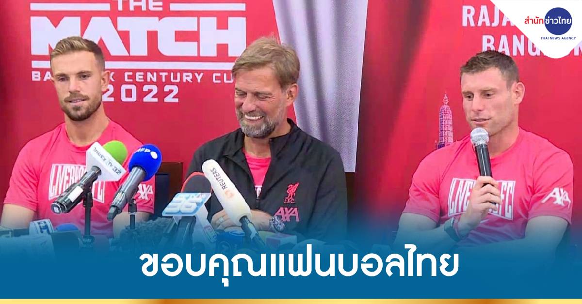 ท่าอากาศยานสุวรรณภูมิ 10 ก.ค.-เจอร์เกน คลอปป์ ผู้จัดการทีมลิเวอร์พูล ขอบคุณการต้อนรับที่อบอุ่นจากแฟนบอลชาวไทย และต้องรอดูความฟิตของนักเตะว่าจะส่งใครลงสนามลงทำศึกแดงเดือด กับ แมนฯ ยูไนเต็ด ในวันที่ 12 ก.ค.นี้