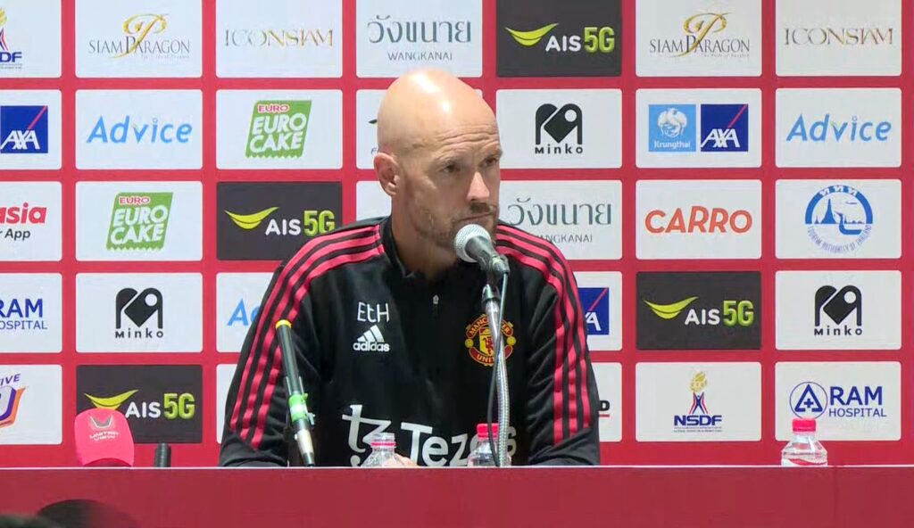 เอริค เทน ฮาก ผู้จัดการทีมคนใหม่ของแมนเชสเตอร์ ยูไนเต็ด เปิดแถลงความพร้อมของทีมอย่างเป็นทางการ ที่ราชมังคลากีฬาสถาน หลังเดินทางมาถึงประเทศไทยตั้งแต่เมื่อวันเสาร์ที่ผ่านมา และได้ลงฝึกซ้อม รวมถึงทำกิจกรรมกับสปอนเซอร์ไปบ้างแล้วนั้น