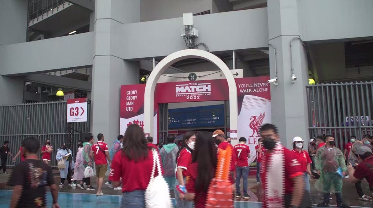 บรรยากาศภายในการกีฬาแห่งประเทศไทย หน้าสนามราชมังคลากีฬาสถาน ก่อนเกม THE MATCH Bangkok Century Cup 2022 ระหว่าง แมนเชสเตอร์ ยูไนเต็ด กับ ลิเวอร์พูล เป็นไปอย่างคึกคัก แฟนบอลทยอยเข้าสนามกันเกือบหมดแล้ว หลังจากร่วมกิจกรรมกับเหล่าสปอนเซอร์ แม้ก่อนหน้านี้ เมื่อเวลาประมาณ 16.00 น. ฝนตกลงมาอย่างหนัก แต่ทุกคนไม่ท้อ ยังรอเพื่อจะเข้าไปชมแมตช์สำคัญ ซึ่งฝนตกเพียงแค่ 30 นาที ก็หยุดลง