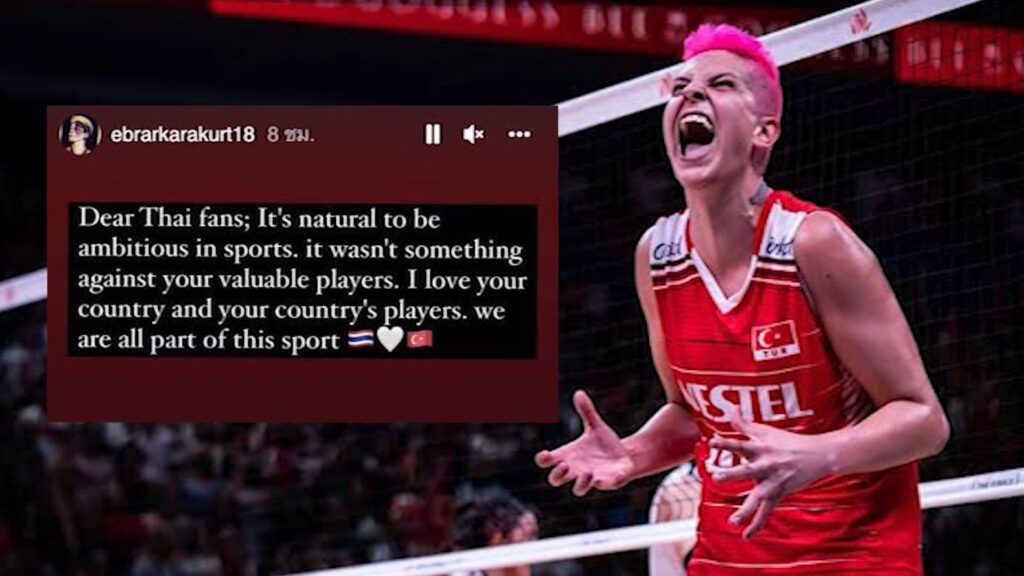 ส่วนประเด็นดราม่าที่ เอบรา คาราคูร์ต นักกีฬาทีมชาติตุรกี ผู้มีเอกลักษณ์ตัดผมสั้นย้อมผมสีชมพู แสดงความดีใจทุกครั้งที่ตบใส่สาวไทยด้วยการ “ตะโกนใส่อย่างสะใจ” จนมีแฟนกีฬาชาวไทยมองว่าเป็นการแสดงออกที่มากเกินไป ล่าสุด คาราคูร์ต ออกมาชี้แจงผ่านอินสตาแกรมส่วนตัวระบุว่า “ถึงแฟนวอลเลย์บอลไทย มันเป็นเรื่องธรรมชาติมากที่เราจะแสดงความกระหายในระหว่างการแข่งขัน นี่ไม่ใช่เรื่องความขัดแย้งกับนักกีฬาของคุณ ฉันรักประเทศของคุณและผู้เล่นของพวกคุณ เราทุกคนเป็นส่วนหนึ่งของกีฬานี้”