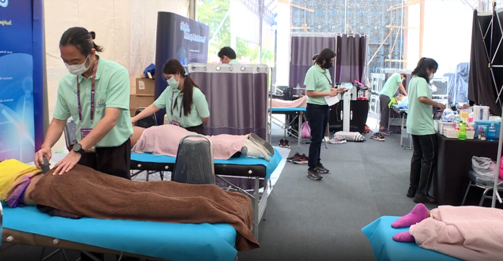 “น้องการ์ฟิลด์” วันเฉลิมพร วันเชาว์ และ “น้องเฟิร์ส” พงษกร แนวโสภี 2 นักกีฬาเปตองจากจังหวัดพิจิตร ที่มาใช้บริการครั้งแรก หลังจากมีอาการเจ็บจากการโยนลูกเปตอง เจ้าหน้าที่ให้ยืดเส้นและกระตุ้นด้วยเครื่องไฟฟ้า ทำให้รู้สึกดีขึ้น หายจากอาการตึง พร้อมกลับไปแข่งขัน