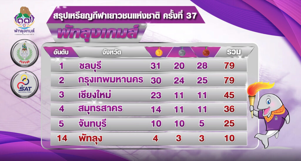 สรุปเหรียญทอง ล่าสุด จังหวัดชลบุรี นำอันดับ 1 มี 31 เหรียญทอง 20 เหรียญเงิน 28 เหรียญทองแดง อันดับ 2 กทม30 ทอง อันดับ 3 เชียงใหม่ 23 ทอง อันดับ 4 สมุทรสาคร 14 ทอง และ จันทบุรี 10 ทอง ส่วน พัทลุง เจ้าภาพ มี 4 ทอง อยู่อันดับ 14 .-สำนักข่าวไทย