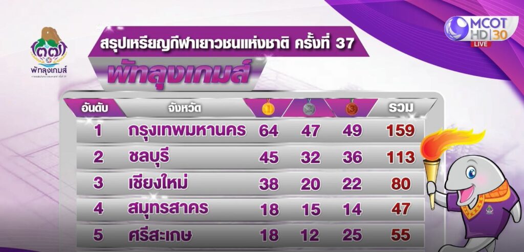 สรุปเหรียญทองล่าสุด กทม. นำอันดับ 1 มี 64 เหรียญทอง 47 เหรียญเงิน 49 เหรียญทองแดง อันดับ 2 ชลบุรี 45 ทอง อันดับ 3 เชียงใหม่ 38 ทอง อันดับ 4 สมุทรสาคร 18 ทอง และอันดับ 5 ศรีสะเกษ 18 ทอง ส่วนพัทลุง เจ้าภาพ มี 9 ทอง อยู่อันดับ 11 (อัปเดต เวลา 18.10 น.) .-สำนักข่าวไทย
