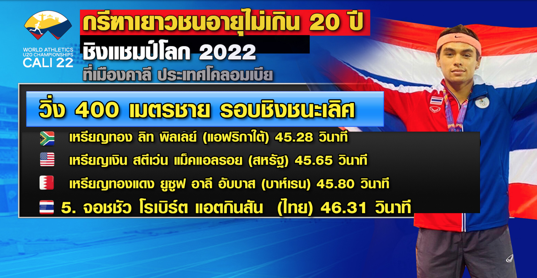 การแข่งขันกรีฑาเยาวชนอายุไม่เกิน 20 ปี ชิงแชมป์โลก 2022 ระหว่างวันที่ 1-6 สิงหาคม ที่เมืองคาลี ประเทศโคลอมเบีย วิ่ง 400 เมตร ชาย รอบชิงชนะเลิศ จอชชัว โรเบิร์ต แอตกินสัน นักวิ่งดาวรุ่งไทยวัย 19 ปี ที่เข้าสู่รอบชิงพร้อมกับสร้างสถิติประเทศไทยในรุ่นเยาวชนขึ้นมาใหม่ ได้อันดับที่ 5 ทำเวลา 46.31 วินาที เหรียญทองตกเป็นของ ลิท พิลเลย์ จากแอฟริกาใต้ 45.28 วินาที เหรียญเงิน สตีเว่น แม็คแอลรอย จากสหรัฐ 45.65 วินาที เหรียญทองแดง ยูซูฟ อาลี อับบาส จากบาห์เรน 45.80 วินาที