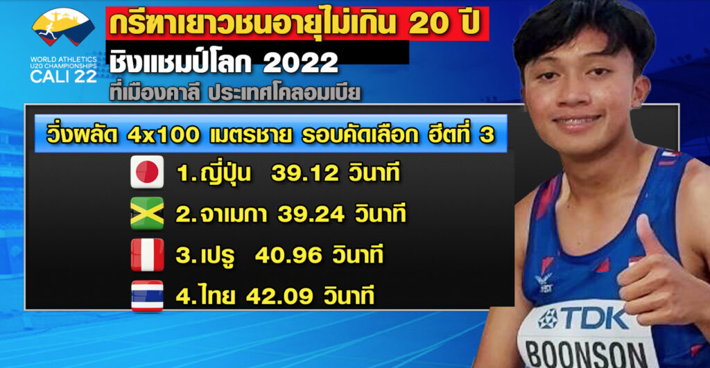 โคลอมเบีย 5 ส.ค.- จอชชัว โรเบิร์ต แอตกินสัน จบอันดับที่ 5 รอบชิงชนะเลิศ กรีฑาเยาวชนชิงแชมป์โลก ขณะที่ทีมผลัด 4 x100 เมตรไทย ไม่ผ่านเข้ารอบชิงฯ
