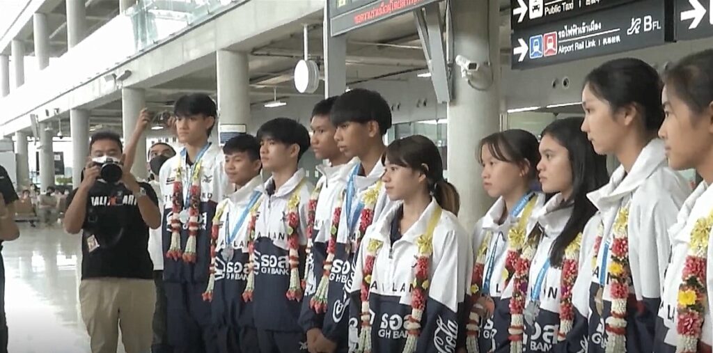 นักเทควันโดเยาวชนทีมชาติเดินทางกลับถึงท่าอากาศยานสุวรรณภูมิ หลังเสร็จจากการแข่งขันเทควันโดเยาวชนชิงแชมป์โลก รายการ “โซเฟีย เวิลด์ เทควันโด จูเนียร์ แชมเปียนชิพส์ 2022” ที่กรุงโซเฟีย ประเทศบัลแกเรีย โดยคว้ามาได้ 1 ทอง 3 เงิน 2 ทองแดง จาก “น้องขนมจีบ” ณัฐกมล วาสนา รุ่น 44 กก.หญิง ส่วนเหรียญเงิน ได้จากบัลลังก์ ทับแดงแดง รุ่น 59 กก.ชาย, กมลชนก สีเคน รุ่น 49 กก.หญิง, พรภวิษย์ โตรื่น รุ่น 48 กก.ชาย และเหรียญทองแดง ได้จากพัชรกัญน์ พูลเกิด รุ่น 46 กก.หญิง กับ อิทธิพร สินสังข์ รุ่น 51 กก.ชาย โดยมี “บิ๊กเอ” ผศ.พิมล ศรีวิกรม์ นายกสมาคมกีฬาเทควันโด แห่งประเทศไทย เดินทางมารับพร้อมผู้ปกครอง