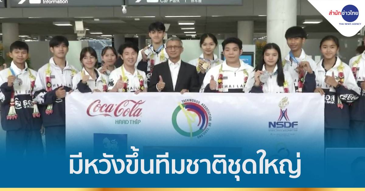 สนามบินสุวรรณภูมิ 10 ส.ค.- นักเทควันโดเยาวชนทีมชาติไทยเดินทางกลับถึงท่าอากาศยานสุวรรณภูมิ นายกสมาคมกีฬาเทควันโดฯ ชี้หลายคนมีโอกาสขึ้นเป็นทีมชาติชุดใหญ่ หลังคว้าเหรียญในเทควันโดเยาวชนชิงแชมป์โลก ที่บัลแกเรีย