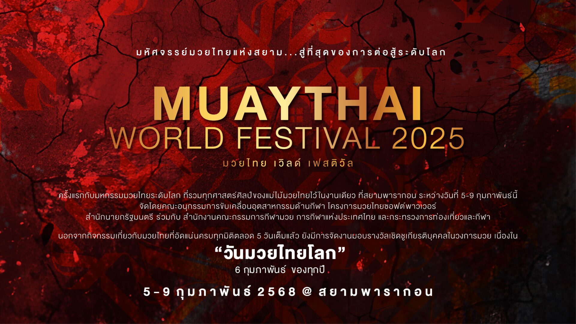 นับถอยหลัง “มวยไทย เวิลด์ เฟสติวัล” มหัศจรรย์มวยไทยแห่งสยาม..สู่ที่สุดของการต่อสู้ระดับโลก ครั้งแรกกับมหกรรมมวยไทยระดับโลก ที่รวมทุกศาสตร์ศิลป์ของแม่ไม้มวยไทยไว้ในงานเดียว ที่สยามพารากอน ระหว่างวันที่ 5-9 กุมภาพันธ์นี้ จัดโดยคณะอนุกรรมการขับเคลื่อนอุตสาหกรรมด้านกีฬา โครงการมวยไทยซอฟต์พาวเวอร์ สำนักนายกรัฐมนตรี ร่วมกับ สำนักงานคณะกรรมการกีฬามวย การกีฬาแห่งประเทศไทย และกระทรวงการท่องเที่ยวและกีฬา โดยหนึ่งในไฮไลต์สำคัญของงาน นอกจากกิจกรรมเกี่ยวกับมวยไทยที่อัดแน่นครบทุกมิติตลอด 5 วันเต็มแล้ว ยังมีการจัดงานมอบรางวัลเชิดชูเกียรติบุคคลในวงการมวย เนื่องใน “วันมวยไทย” ซึ่งตรงกับวันที่ 6 กุมภาพันธ์ ของทุกปีด้วย
