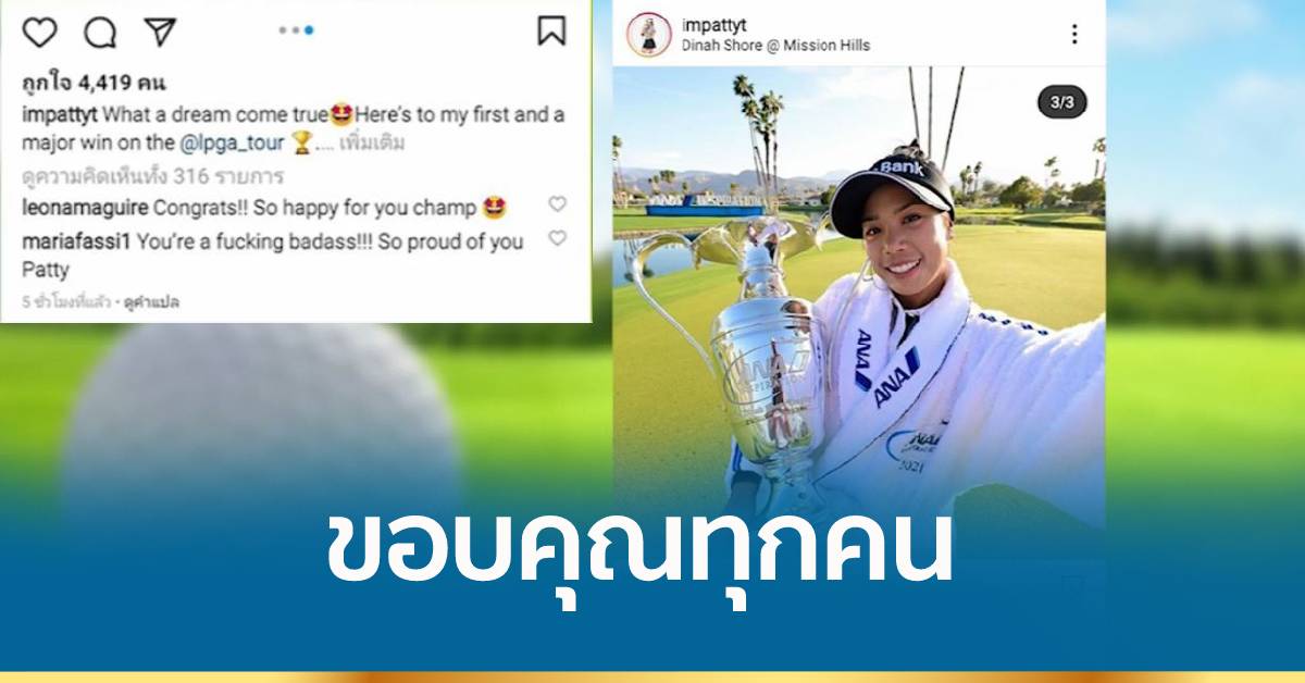 “โปรเหมียว” หรือ “โปรแพตตี้” ปภังกร ธวัชธนกิจ นักกอล์ฟสาวไทย วัย 21 ปี มือ 103 ของโลก ที่คว้าแชมป์กอล์ฟเมเจอร์ รายการ “เอเอ็นเอ อินสไพเรชัน 2021” ที่สนามมิสชัน ฮิลล์ รัฐแคลิฟอร์เนีย สหรัฐ พร้อมเงินรางวัลประมาณ 14.6 ล้านบาท ได้โพสต์อินสตาแกรม ขอบคุณพ่อแม่ รวมทั้งโค้ช และทุกคนที่มีส่วนในการทำให้เธอประสบความสำเร็จอย่างเหลือเชื่อ ด้วยการคว้าแชมป์เมเจอร์แรกในชีวิต พร้อมย้ำว่า “เมื่อเราเชื่อมั่นในตนเองและมีเป้าหมายที่ชัดเจน ไม่มีอะไรที่เราทำไม่ได้”