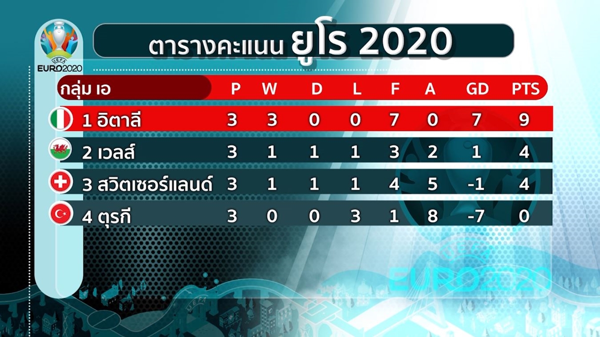 สรุปตารางคะแนนกลุ่ม A อิตาลี มี 9 คะแนน เข้ารอบ 16 ทีมสุดท้าย เป็นอันดับ 1 เวลส์ มี 4 คะแนน เข้ารอบเป็นอันดับ 2 สวิตเซอร์แลนด์ มี 4 คะแนนเช่นกัน แต่ผลประตูได้เป็นรอง เวลส์ ต้องรอลุ้นเป็น 1 ใน 4 ทีมอันดับ 3 ที่คะแนนดีที่สุดที่จะได้ผ่านเข้ารอบต่อไป ส่วน ตุรกี 3 นัด แพ้รวด ตกรอบแรก. – สำนักข่าวไทย