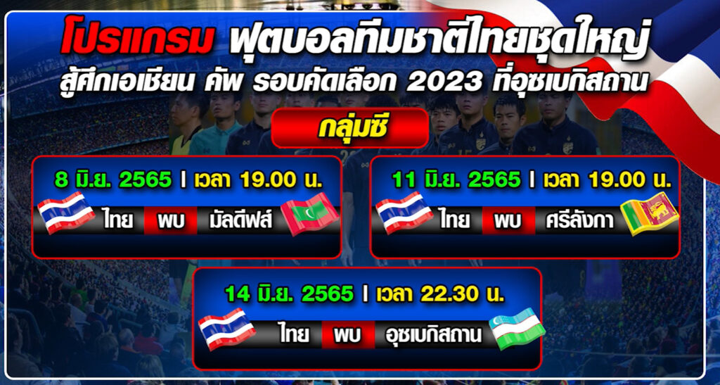 สำหรับทีมชาติไทยชุดใหญ่ มีโปรแกรมพบกับ มัลดีฟส์ วันที่ 8 มิถุนายน, ศรีลังกา วันที่ 11 มิถุนายน และอุซเบกิสถาน วันที่ 14 มิถุนายน รายการนี้หาแชมป์กลุ่มจาก 6 กลุ่ม และรองแชมป์กลุ่ม 5 จาก 6 กลุ่ม รวมเป็น 11 ทีม ผ่านเข้าไปเล่นฟุตบอล เอเชียนคัพ 2023 รอบสุดท้าย ระหว่างวันที่ 16 มิถุนายน – 16 กรกฎาคมในปีหน้า . – สำนักข่าวไทย