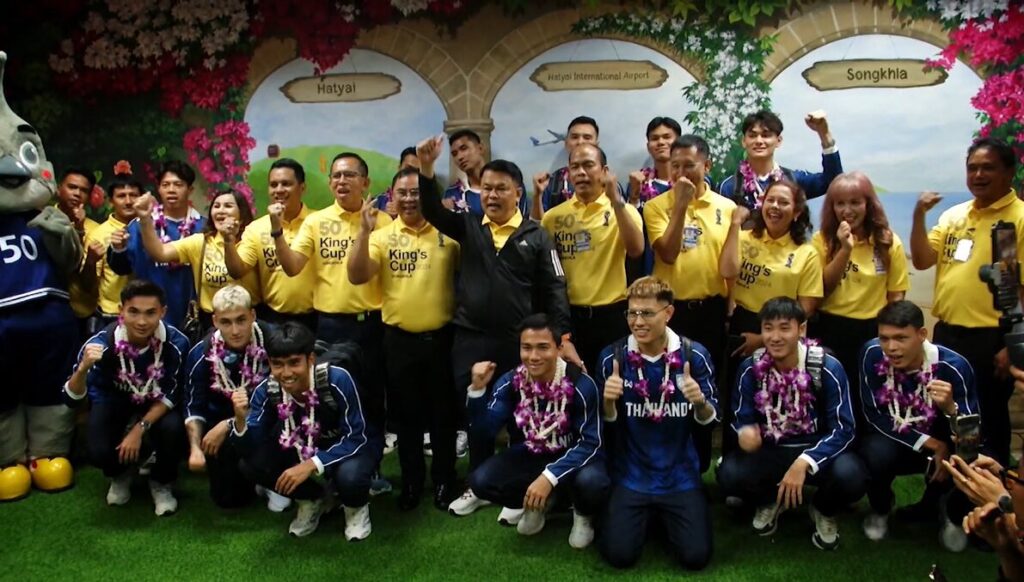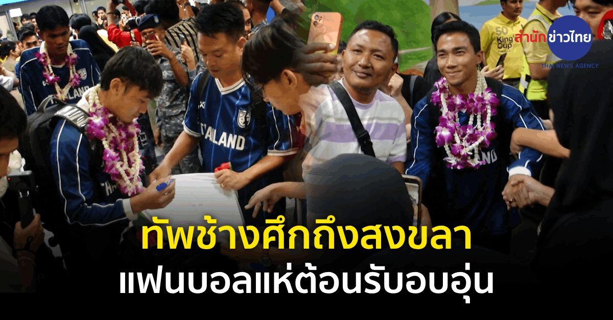 หาดใหญ่ 7 ต.ค. – นักเตะทีมชาติไทย เดินทางถึงจังหวัดสงขลา แฟนบอลแห่ต้อนรับอบอุ่น ก่อนลุยศึกฟุตบอลชิงถ้วยพระราชทานคิงส์คัพ ครั้งที่ 50