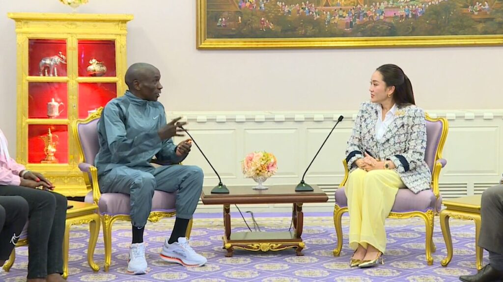 ส่วนช่วงบ่ายวันนี้ น.ส.แพทองธาร ชินวัตร นายกรัฐมนตรี ได้เปิดตึกไทยคู่ฟ้า ทำเนียบรัฐบาลต้อนรับ เอเลียด คิปโชเก ในฐานะแขกเกียรติยศ และได้ขอบคุณ คิปโชเก ที่ตอบรับเป็นทูตด้านการท่องเที่ยวกีฬาและวัฒนธรรมของไทยเป็นเวลา 3 ปี และเข้าร่วมกิจกรรมและประชาสัมพันธ์การแข่งขันวิ่งมาราธอน “อะเมซิ่ง ไทยแลนด์ มาราธอน แบงค็อก 2024” โดยเชื่อว่าจะเป็นโอกาสดีที่จะมีการแลกเปลี่ยนให้นักกีฬาไทยไปฝึกซ้อมที่เคนยา ซึ่งจะเป็นการเปิดโลกให้กับนักกีฬาไทยได้เรียนรู้ว่านักกีฬาประเทศอื่นๆ มีการฝึกฝนกีฬาอย่างไร ขณะที่ คิปโชเก ได้ขอบคุณรัฐบาลไทย ที่ได้เชิญเขามาเป็น “ทูตด้านการท่องเที่ยว กีฬา และวัฒนธรรม” และรู้สึกประทับใจในการท่องเที่ยว การกีฬา และวัฒนธรรมของไทยอย่างมาก พร้อมคาดหวังว่า การทำหน้าที่ของตนจะทำให้เกิดการแลกเปลี่ยนทางวัฒนธรรม ระหว่างประเทศเคนยา กับ ประเทศไทย มากยิ่งขึ้น