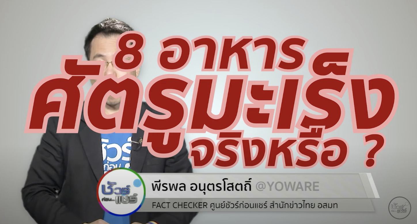 จากกรณีมีการแชร์ข้อแนะนำว่า เราควรหันมาบริโภคศัตรูของมะเร็ง เช่น กระเทียม เป็นศัตรูของมะเร็งกระเพาะอาหาร เห็ด เป็นศัตรูของมะเร็งตับ ผักโขม เป็นศัตรูของมะเร็งปอด