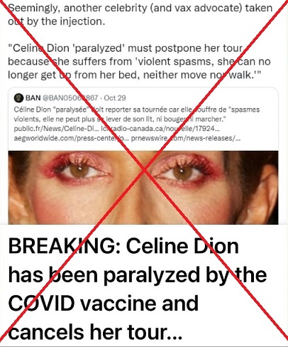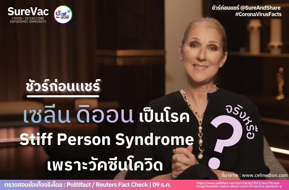 มีข้อมูลเท็จเผยแพร่ทางสื่อสังคมออนไลน์ในต่างประเทศ เมื่อมีการอ้างว่าสาเหตุที่ทำให้ เซลีน ดิออน นักร้องสาวคนดังวัย 54 ปีต้องป่วยเป็นโรค Stiff Person Syndrome หรือโรคคนแข็ง จนต้องเลื่อนการแสดงทัวร์คอนเสิร์ต เป็นผลมาจากการฉีดวัคซีนโควิด-19 เพราะมีหลักฐานยืนยันว่า Stiff Person Syndrome คือหนึ่งในอาการไม่พึงประสงค์จากวัคซีนโควิด-19 ของบริษัท Pfizer-BioNTech