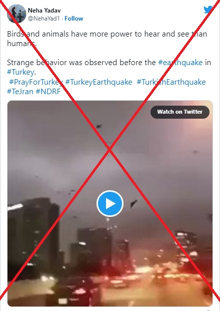 มีคลิปวิดีโอข้อมูลบิดเบือนแพร่ทาง Twitter ในหลายประเทศ โดยอ้างว่าก่อนเหตุแผ่นดินไหวในประเทศตุรกีเมื่อวันที่ 6 กุมภาพันธ์ปี 2023 พบฝูงนกบินอย่างแตกตื่นบริเวณทางด่วนในประเทศตุรกี เป็นสิ่งยืนยันว่าสัตว์มีสัญชาตญาณรับรู้ภัยพิบัติได้ดีกว่ามนุษย์ จนมีการนำคลิปดังกล่าวไปแชร์ต่อกันมากมาย
