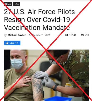 มีข้อมูลเท็จเผยแพร่ทาง Facebook ในสหรัฐอเมริกา โดยอ้างว่านักบินของกองทัพอากาศสหรัฐอเมริกาจำนวน 27 ราย ขอลาออกจากกองทัพเพื่อประท้วงนโยบายบังคับฉีดวัคซีนโควิด-19 ที่ประกาศโดยกระทรวงกลาโหมสหรัฐอเมริกา จนต่อมาข้อความดังกล่าวถูกทาง Facebook ตั้งสถานะให้เป็นข่าวปลอม