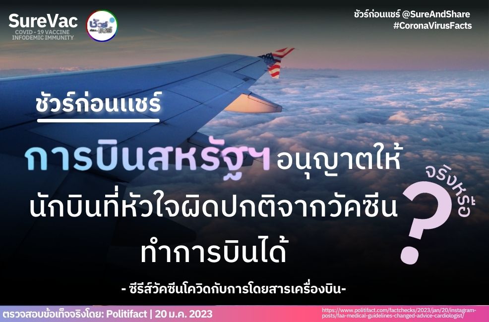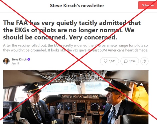 มีข้อมูลเท็จเผยแพร่ทาง Twitter ในสหรัฐอเมริกา เมื่อมีข้อความอ้างว่า องค์การบริหารการบินแห่งชาติสหรัฐอเมริกา (FAA) ยอมรับแบบอ้อมๆ ว่ามีนักบินจำนวนมากที่เกิดปัญหาหัวใจผิดปกติจากวัคซีนโควิด-19 ด้วยการเปลี่ยนกฎเพื่ออนุญาตให้นักบินที่มีผลตรวจ PR interval จากเครื่องวัดคลื่นไฟฟ้าหัวใจ (ECG) เกินกว่าค่ามาตรฐาน สามารถขึ้นบินได้โดยไม่ต้องยื่นเอกสารด้านสุขภาพเพิ่มเติม จนกลายเป็นข้อความที่ทำยอดไลค์กว่า 9,000 ครั้งและถูกแชร์ไปกว่า 6,000 ครั้ง