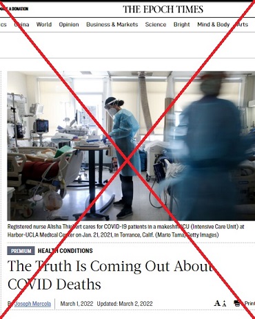 มีข้อมูลเท็จเผยแพร่ทางเว็บไซต์ในสหรัฐอเมริกา โดย Epoch Times เว็บไซต์ที่มีประวัติเผยแพร่ข้อมูลเท็จเกี่ยวกับโควิด-19 ได้ตีพิมพ์บทความของ โจเซฟ เมอร์โคลา ผู้ที่ศูนย์ Center for Countering Digital Hate ยกให้เป็นผู้เผยแพร่ข้อมูลเท็จเพื่อการต่อต้านวัคซีนที่เลวร้ายที่สุด โดยเขาแสดงความเห็นว่ายอดการเสียชีวิตจากการติดเชื้อโควิด-19 สูงเกินความเป็นจริง เพราะแพทย์จงใจรวมการเสียชีวิตของผู้ติดเชื้อที่มีโรคประจำตัวให้มีสาเหตุการตายจากการติดเชื้อโควิด-19 ทั้งหมด โดยตั้งข้อสังเกตว่าสาเหตุการเสียชีวิตของผู้ป่วยโควิด-19 ส่วนใหญ่ มาจากการทำงานที่บกพร่องของเครื่องช่วยหายใจ และมีความพยายามของโรงพยาบาลในสหรัฐฯ เพื่อเพิ่มยอดผู้ป่วยโควิด-19 เนื่องจากจะได้รับเงินช่วยเหลือจากรัฐบาลสหรัฐฯ มากกว่าการรักษาผู้ป่วยทั่วไป