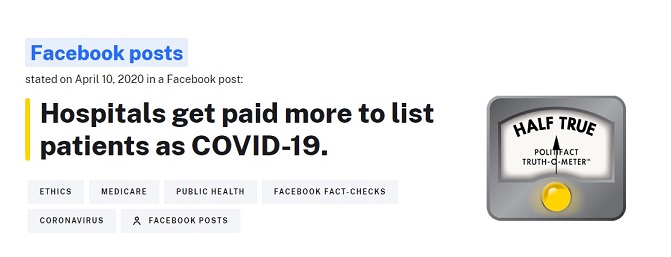 แม้จะเป็นจริงที่ว่า โรงพยาบาลในสหรัฐฯ จะทำเงินจากระบบประกันสุขภาพได้มากกว่า หากรักษาผู้ป่วยติดเชื้อโควิด-19 แต่ไม่หลักฐานว่ามีโรงพยาบาลบิดเบือนยอดผู้ป่วยติดเชื้อโควิด-19 ให้สูงเกินจริงเพื่อหวังกำไร เพราะการรายงานยอดผู้ป่วยและเสียชีวิตจากการติดเชื้อโควิด-19 มีการตรวจสอบอย่างเข้มงวด นอกจากนี้ ยังคาดว่ายอดผู้ป่วยจากการติดเชื้อโควิด-19 ในสหรัฐฯ ต่ำกว่าความเป็นจริงจากปัจจัยหลายอย่าง เช่น การไม่ให้ความร่วมมือในการตรวจหาเชื้อ