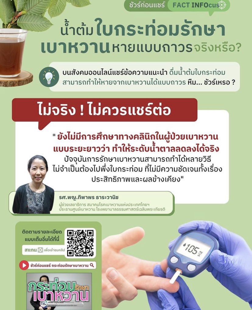 ศูนย์ชัวร์ก่อนแชร์ ตรวจสอบกับ รศ.พญ.ทิพาพร ธาระวานิช ผู้ช่วยเลขาธิการ สมาคมโรคเบาหวานแห่งประเทศไทยฯ ประธานศูนย์เบาหวาน โรงพยาบาลธรรมศาสตร์เฉลิมพระเกียรติ
