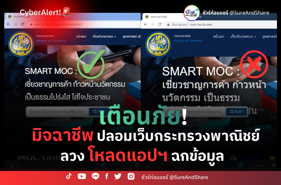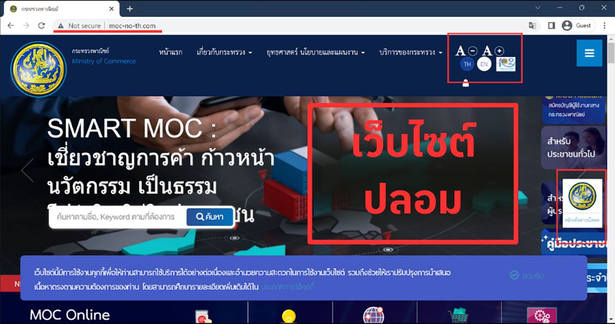 บช.สอท. ตรวจสอบพบว่า http://moc-no-th.com เป็นเว็บไซต์ปลอมที่มิจฉาชีพสร้างขึ้นเพื่อฉวยโอกาสจากความเชื่อถือ และความไม่รู้ของประชาชน โดยสร้างเลียนแบบให้คล้ายคลึงกันกับเว็บไซต์จริงของกระทรวงพาณิชย์ (https://www.moc.go.th) อีกทั้งภายในยังมีการใช้สัญลักษณ์ของหน่วยงาน หากประชาชนไม่ได้สังเกตเห็นความแตกต่างหรือไม่เคยใช้บริการเว็บไซต์จริงมาก่อนอาจตกเป็นเหยื่อได้