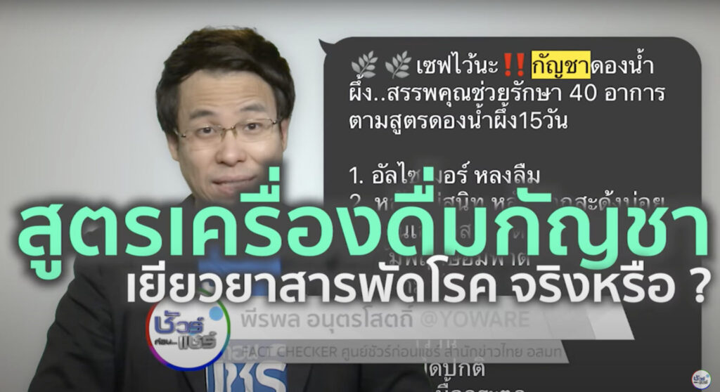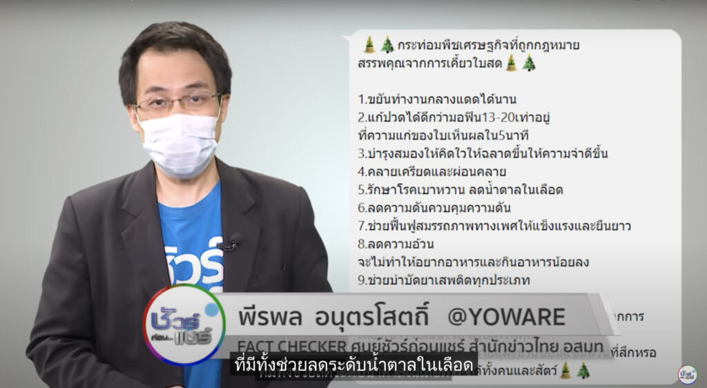 22 มี.ค. 66 – จากกรณีมีการแชร์เกี่ยวกับกระท่อมและกัญชาเอาไว้มากมาย หลายคนก็ว่าเครื่องดื่มกัญชารักษาสารพัดโรค และน้ำต้มใบกระท่อมรักษาเบาหวานให้หายขาดได้ เรื่องไหนจริง เรื่องไหนเท็จ พบคำตอบได้ที่ชัวร์ก่อนแชร์ CHECK-LIST ร้อยเรียงเรื่องฮิต ติดอันดับกับชัวร์ก่อนแชร์