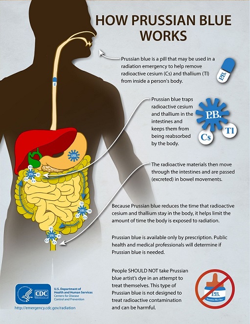 ข้อมูลจากศูนย์ควบคุมและป้องกันโรคแห่งชาติสหรัฐอเมริกา (CDC) ระบุว่า ยา Prussian Blue ช่วยลดความรุนแรงจากการสัมผัสกัมมันตรังสีชนิดซีเซียม-137 ได้อย่างมาก โดยตัวยาจะเข้าไปจับกับสารพิษในลำไส้เพื่อลดการดูดซึมเข้าสู่ร่างกาย การประเมินพบว่ายา Prussian Blue ช่วยลดค่าครึ่งชีวิตทางชีวภาพของซีเซียม-137 ในร่างกายผู้สัมผัสจาก 110 วันเหลือเพียง 30 วัน