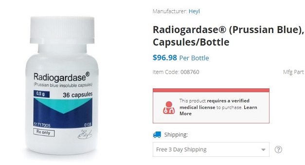ราคาของยา Prussian Blue ค่อนข้างสูง หนึ่งกระปุกบรรจุ 36 แคปซูลมีราคาเกือบ 100 ดอลลาร์สหรัฐ