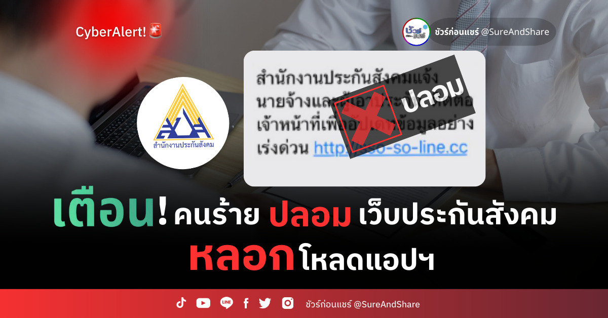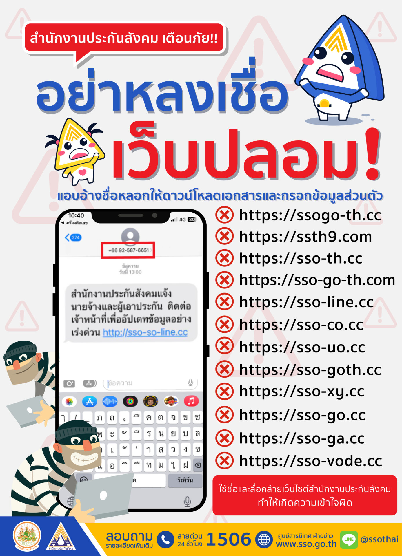 สำนักงานประกันสังคมเตือนภัย มิจฉาชีพส่ง SMS พร้อมแนบลิงก์เว็บไซต์ปลอม หลอกให้ติดตั้งแอปพลิเคชัน เพื่อขโมยข้อมูลสำคัญ เป็นเหตุให้สูญเสียเงิน และถูกนำข้อมูลไปก่ออาชญากรรมได้ ล่าสุดเร่งประสานงาน เพื่อปิดเว็บไซต์ปลอมแล้ว ย้ำ ! ทางสำนักงานไม่มีนโยบายดังกล่าว