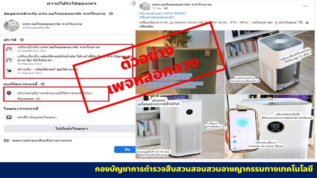 อุบาย : คัดเลือกรูปภาพ คุณสมบัติเครื่องฟอกอากาศจากเว็บไซต์จริง ตั้งราคาต่ำกว่าท้องตลาด และยิงโฆษณา เพื่อให้ประชาชนเห็นมากขึ้น รวมถึงใช้บัญชีหน้าม้ารีวิวสินค้า เพื่อสร้างความน่าเชื่อถือ