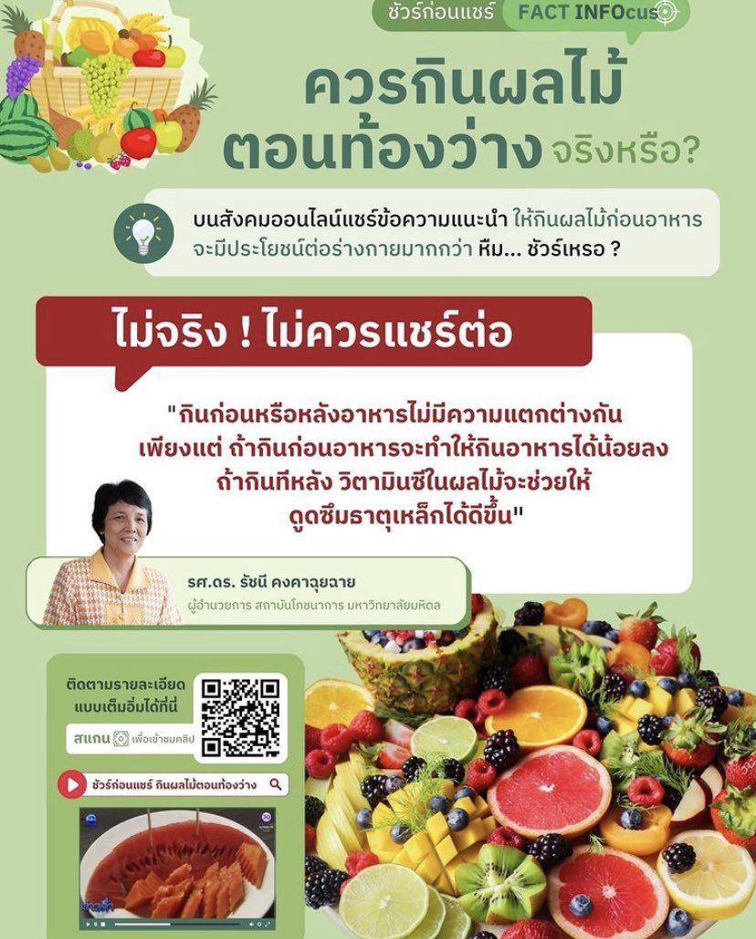 จากกรณีมีการแชร์แนะนำให้กินผลไม้ก่อนอาหารจะมีประโยชน์ต่อร่างกายมากกว่ากินผลไม้หลังอาหารนั้น