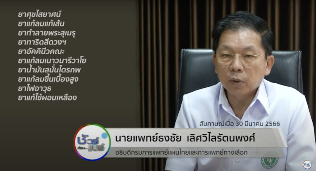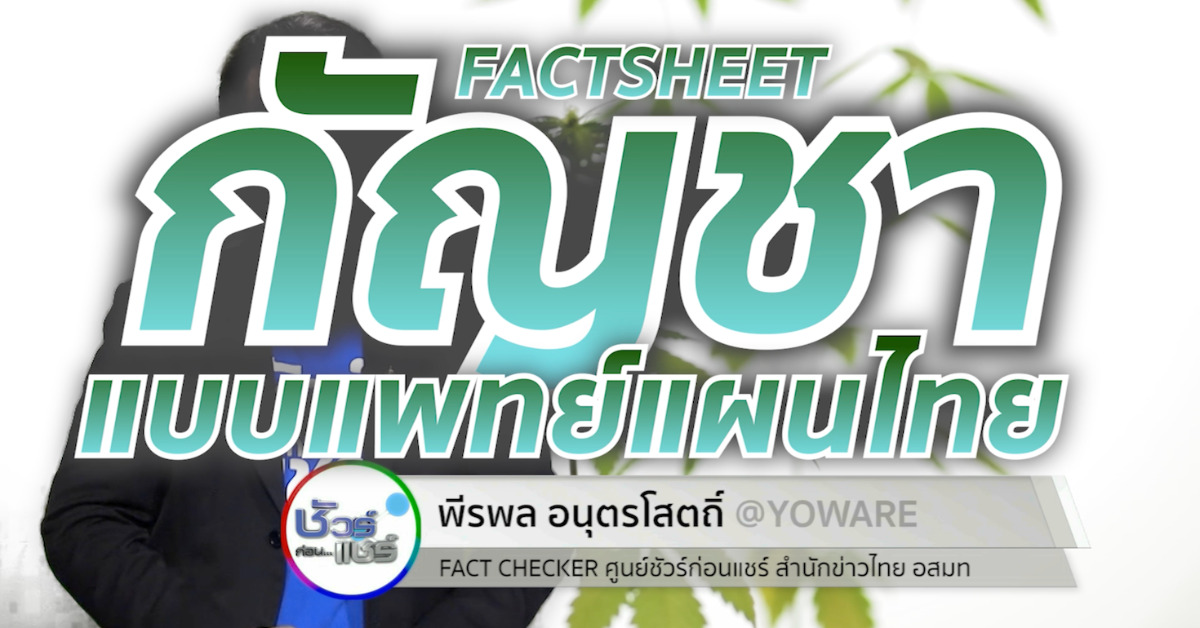 ศูนย์ชัวร์ก่อนแชร์ ตรวจสอบกับ นพ.ธงชัย เลิศวิไลรัตนพงศ์ อธิบดีกรมการแพทย์แผนไทยและการแพทย์ทางเลือก กล่าวว่า ประเทศไทยพบข้อมูลว่ากัญชาเป็นส่วนประกอบในตำรับยาแผนไทยมาตั้งแต่สมัยสมเด็จพระนารายณ์มหาราช ไม่ได้ใช้เป็นสมุนไพรเดี่ยว แต่จะปรุงในรูปแบบของการนำกัญชาเข้าตำรับยา ซึ่งในแต่ละตำรับ กัญชาอาจทำหน้าที่ที่แตกต่างกันออกไป