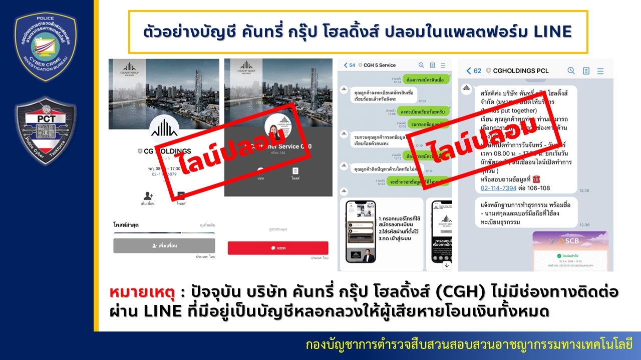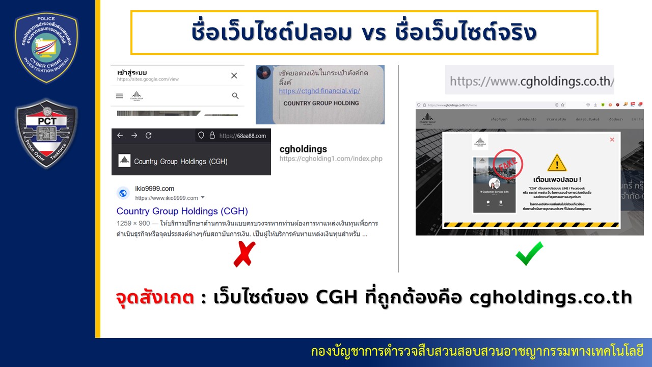 บช.สอท. ได้รับรายงานจาก กองบังคับการตรวจสอบและวิเคราะห์อาชญากรรมทางเทคโนโลยี (บก.ตอท.) ว่า ก่อนหน้านี้ได้รับแจ้งร้องทุกข์เกี่ยวกับการหลอกลวงให้กู้เงิน ผ่านเว็บไซต์ปลอมของบริษัท คันทรี่ กรุ๊ป โฮลดิ้งส์ จำกัด ซึ่งมีความคล้ายคลึงกับเว็บไซต์จริง (https://www.cgholdings.co.th/th) เป็นอย่างมาก มิจฉาชีพอาศัยความน่าเชื่อถือขององค์กรประกอบกับความต้องการขั้นพื้นฐานของประชาชน มาสร้างความเสียหาย โดยแอบอ้างว่าเป็นผู้ให้บริการด้านการเงินแบบครบวงจร และโฆษณาชวนเชื่อถึงข้อเสนอที่ดีมากเกินไป เช่น สมัครได้ง่าย, ให้วงเงินไม่อั้น, อนุมัติเร็ว, มีดอกเบี้ยต่ำ, ไม่ตรวจสอบเครดิตบูโร, ใช้เอกสารน้อย, ปลอดภัย และมีกฎหมาย PDPA คุ้มครอง ทำให้เหยื่อหลงเชื่อจนยอมแอดไลน์ เพื่อติดต่อไปขอรายละเอียดเพิ่มเติม