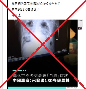 มีข้อมูลบิดเบือนแพร่ทางสื่อสังคมออนไลน์ในในสาธารณรัฐประชาชนจีน โดยอ้างว่าไวรัสโควิด-19 ที่กำลังแพร่ระบาดในเมืองจีน ไม่ใช่สายพันธุ์โอไมครอนอีกต่อไป เนื่องจากภาพเอกซเรย์พบผู้ป่วยที่มีฝ้าที่ปอดอย่างมากจนปอดกลายเป็นสีขาว คาดว่าอาจจะเป็นผลจากการติดเชื้อโควิด-19 สายพันธุ์เดลต้าหรือสายพันธุ์อู่ฮั่นที่มีความรุนแรงยิ่งกว่าสายพันธุ์โอไมครอน