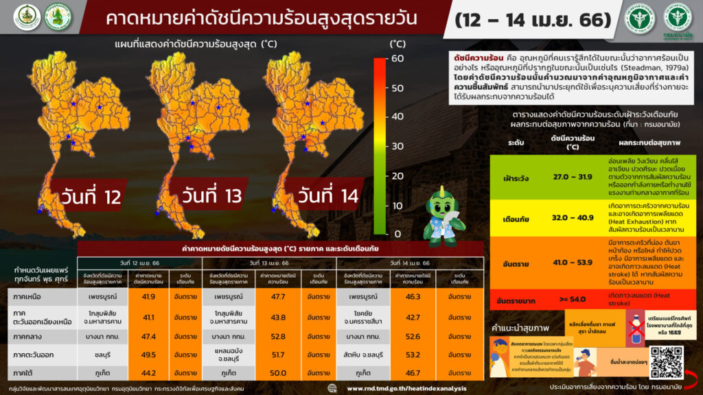 สำหรับอุณหภูมิในประเทศไทยขณะนี้ (14 เม.ย. 66) กรมอุตุนิยมวิทยาพยากรณ์อุณหภูมิสูงสุดราว 37-43 องศาเซลเซียส ในบางพื้นที่ เมื่อคำนวณกับความชื้นเป็น ค่าดัชนีความร้อน ที่ร่างกายจะรู้สึก ส่วนใหญ่ยังคงอยู่ในระดับอันตราย คือ อยู่ในช่วง 41-53.9 องศาเซลเซียส ซึ่งแนวทางการป้องกันอันตรายหลัก เป็นการลดกิจกรรมกลางแจ้ง ใส่หมวกป้องกันแสงแดด สวมเสื้อผ้าที่ระบายอากาศได้ดี และดื่มน้ำสะอาดบ่อย ๆ เพื่อป้องกันการเกิดภาวะฮีตสโตรก