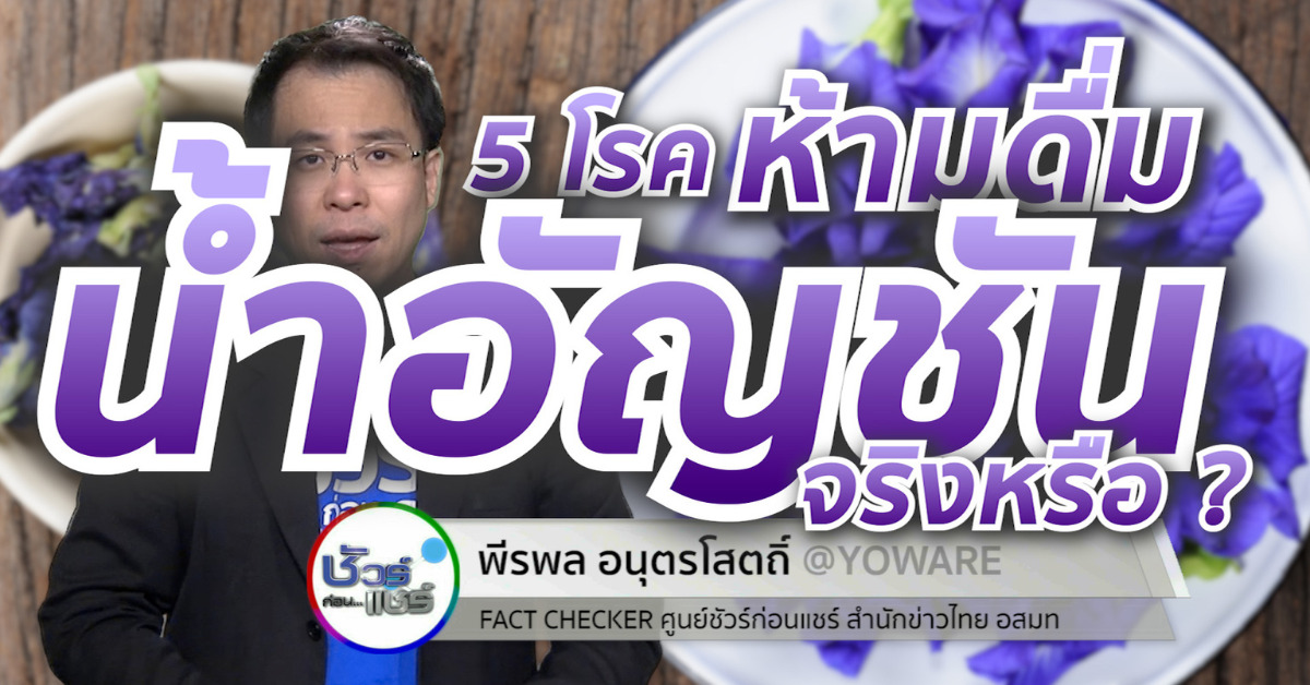 ศูนย์ชัวร์ก่อนแชร์ ตรวจสอบกับ ดร.เภสัชกรหญิงดวงแก้ว ปัญญาภู หัวหน้ากลุ่มงานวิชาการและนวัตกรรม กรมการแพทย์แผนไทยและการแพทย์ทางเลือก ระบุว่า อัญชันนอกจากจะเป็นอาหารแล้วก็ยังมีฤทธิ์ทางยาด้วย ผู้มีโรคเรื้อรังบางโรคควรระวัง ควบคุมอย่าใช้ความเข้มข้นมากนักและห้ามกินต่อเนื่องเป็นเวลานาน