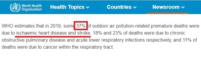 ผลสำรวจเมื่อปี 2019 โดยองค์การอนามัยโลก (WHO) พบว่า สาเหตุการเสียชีวิตก่อนวัยอันควรจากปัญหามลพิษทางอากาศนอกบ้านที่พบมากที่สุด หรือ 37% คือการเสียชีวิตจากโรคหัวใจขาดเลือดและโรคหลอดเลือดสมอง ตามมาด้วยโรคติดเชื้อเฉียบพลันระบบทางเดินหายใจส่วนล่าง (23%) โรคปอดอุดกั้นเรื้อรัง (18%) และโรคมะเร็งระบบทางเดินหายใจ (11%)