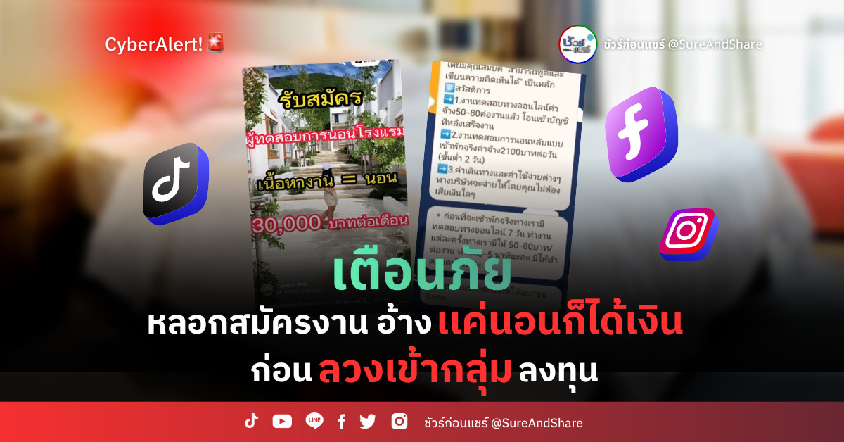 บช.สอท. พบผลจากการตรวจสอบในระบบการรับแจ้งความออนไลน์ว่า ก่อนหน้านี้ได้รับแจ้งร้องทุกข์เกี่ยวกับการหลอกลวงให้ทำงาน หรือทำภารกิจออนไลน์ เพื่อหารายได้ผ่านคลิปวิดีโอโฆษณาตามช่องทางสื่อสังคมออนไลน์เป็นจำนวนมาก ไม่ว่าจะเป็น Facebook, TikTok หรือ Instagram ก็ตาม โดยเป็นงานในตำแหน่งผู้ทดสอบการนอนโรงแรม ซึ่งได้รับแจ้งร้องทุกข์มาเป็นอันดับต้น ๆ เนื่องจากคำกล่าวอ้างบนโฆษณาชวนเชื่ออย่าง “แค่นอนก็ได้เงิน” หรือ “เป็นงานสบายที่ได้ผลตอบแทนสูงกว่า 30,000 บาทต่อเดือน รวมถึงได้รับสวัสดิการ ค่าเดินทาง ค่าใช้จ่ายต่าง ๆ ฟรี” ย่อมดึงดูดให้ประชาชนที่อาจไม่เท่าทันกลโกง และต้องการหารายได้ทางออนไลน์อยู่แล้ว หลงเชื่อจนติดต่อเข้าไปขอรายละเอียดเพิ่มเติมทางแอปพลิเคชันไลน์