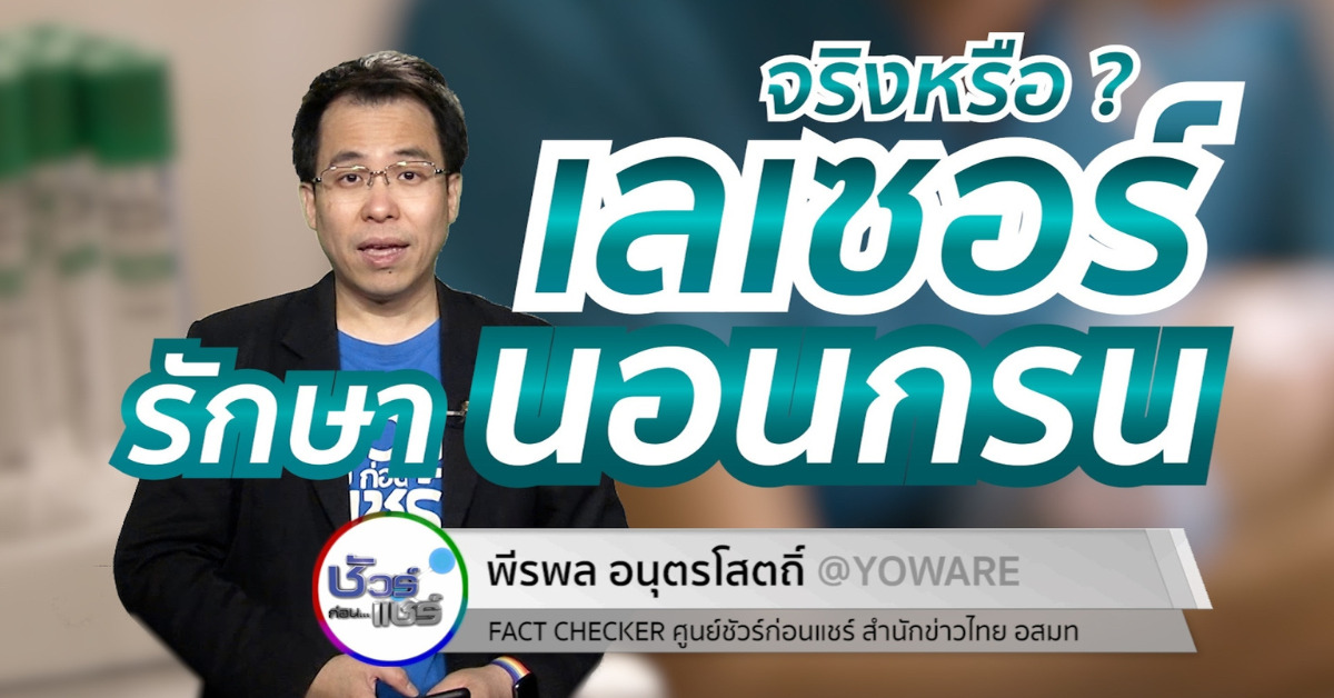 ศูนย์ชัวร์ก่อนแชร์ ศูนย์ชัวร์ก่อนแชร์ ตรวจสอบข้อมูลกับ พญ.นวรัตน์ เกษมสุข ภาควิชาโสต นาสิก ลาริงซ์วิทยา คณะแพทยศาสตร์ศิริราชพยาบาล ระบุว่า การใช้เลเซอร์เป็นการรักษาอีกแนวทางหนึ่งสำหรับผู้ป่วยนอนกรน ตามคลิปที่แชร์มาจะเป็นการยิงเลเซอร์เพื่อเพิ่มความตึงตัวของเพดานอ่อน ส่วนผลการรักษาหลังทำเลเซอร์ก็คือเสียงกรนเบาลง แต่สำหรับผู้ป่วยที่มีภาวะหยุดหายใจระหว่างหลับ การเลเซอร์อย่างเดียวอาจจะไม่เพียงพอ