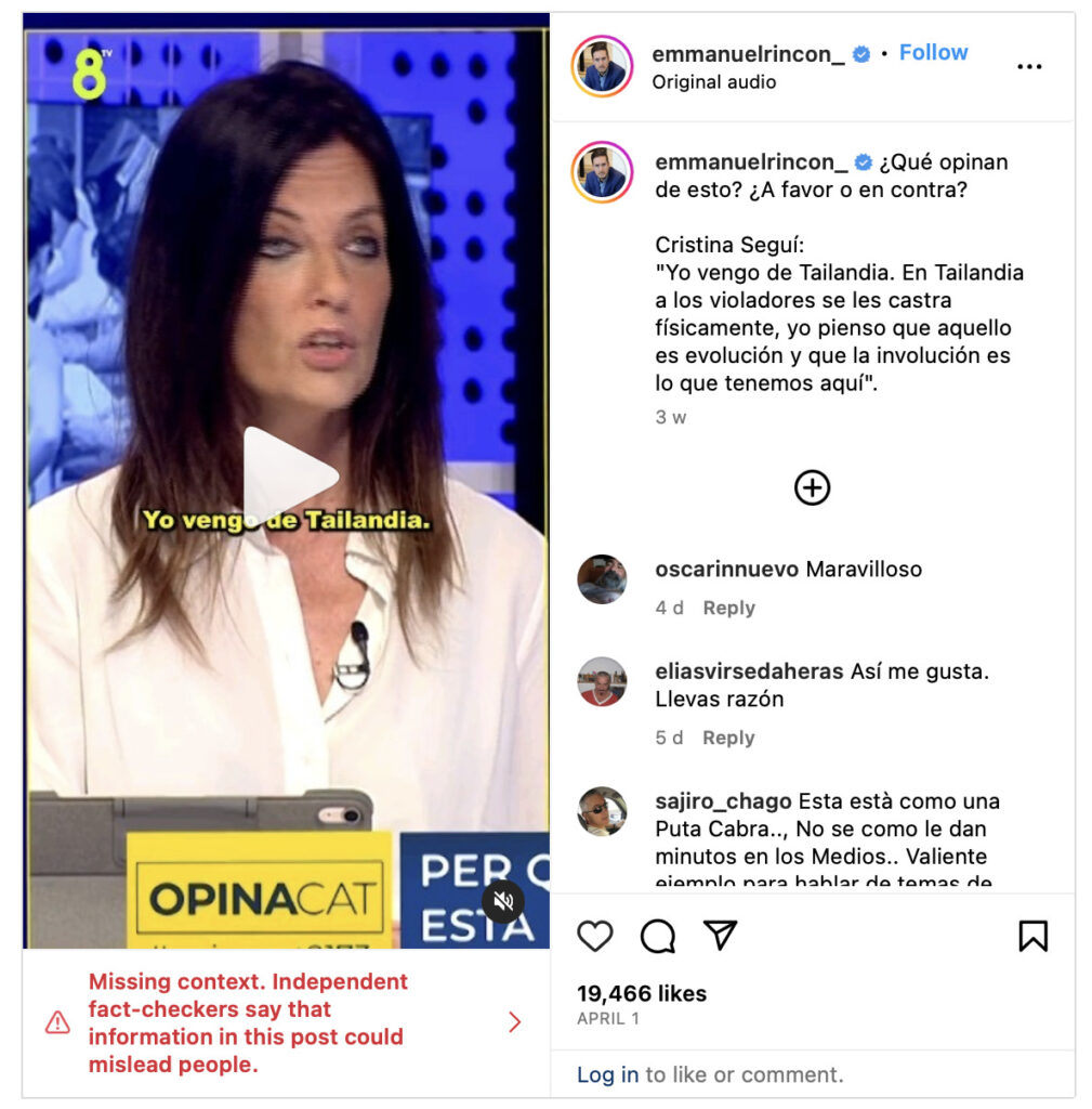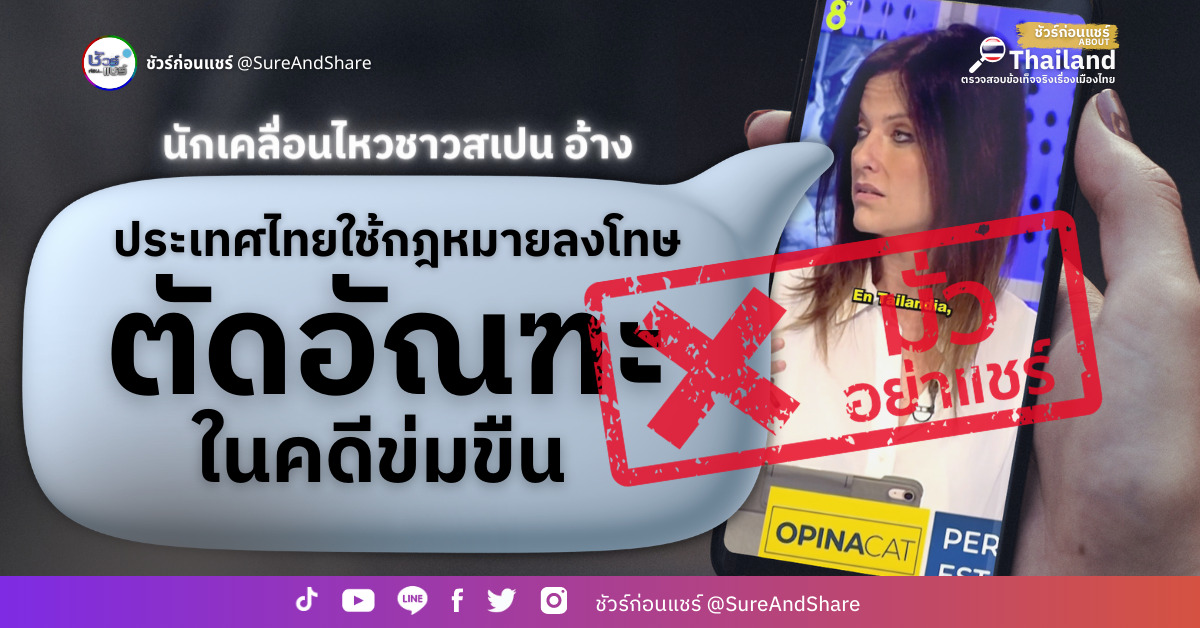 ศูนย์ชัวร์ก่อนแชร์ ได้รับการประสานตรวจสอบจาก Verificador หน่วยตรวจยืนยันข้อมูล ของสื่อ La República ในประเทศเปรู ว่า มีการกล่าวอ้างที่เกี่ยวข้องกับประเทศไทย โดยมีนักเคลื่อนไหวทางการเมืองสตรีชื่อ “Cristina Seguí” กล่าวผ่านรายการโทรทัศน์ Opina Cat ทางช่อง TV8 ในประเทศสเปน เมื่อวันที่ 29 มีนาคม 2566 ซึ่งต่อมาได้รับการการกดถูกใจและแชร์อย่างกว้างขวาง รวมกว่า 20,000 ครั้ง บนสื่อสังคมทั้ง Twitter Instagram และ TikTok