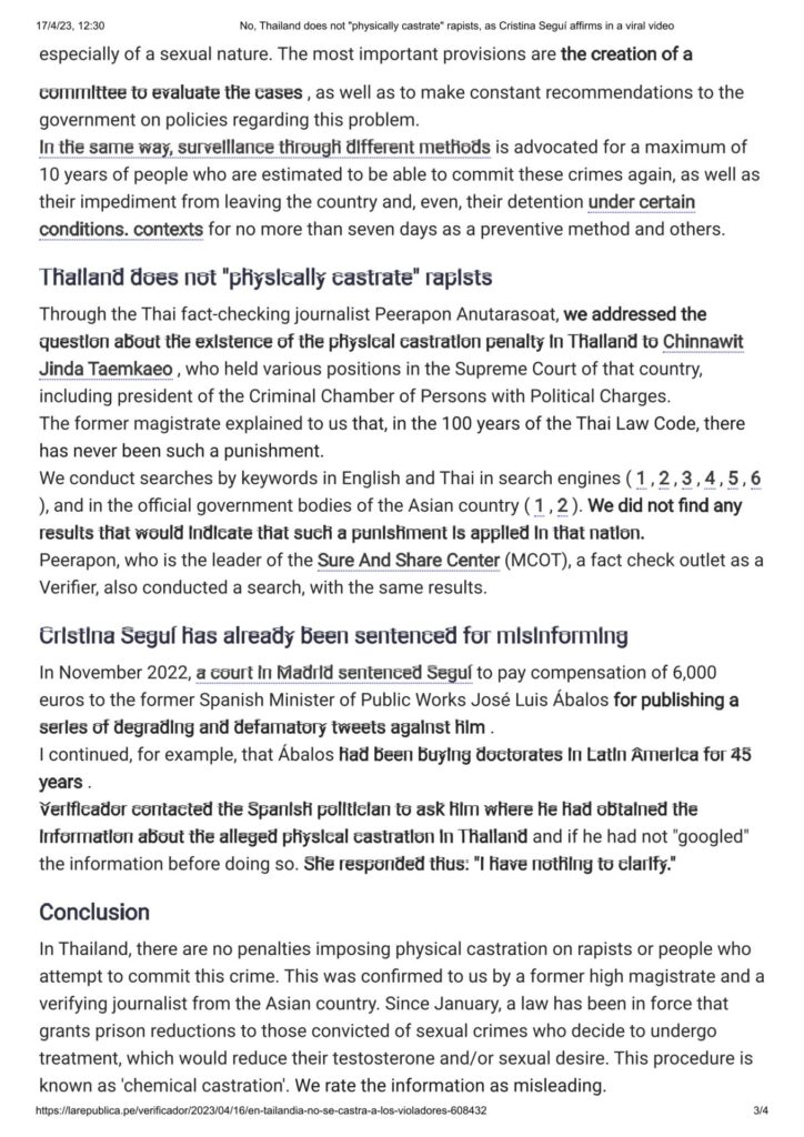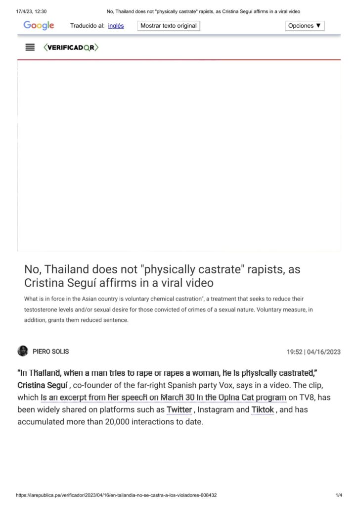 - [ข่าว La República] No, Tailandia no “castra físicamente” a violadores, como afirma Cristina Seguí en video viral
