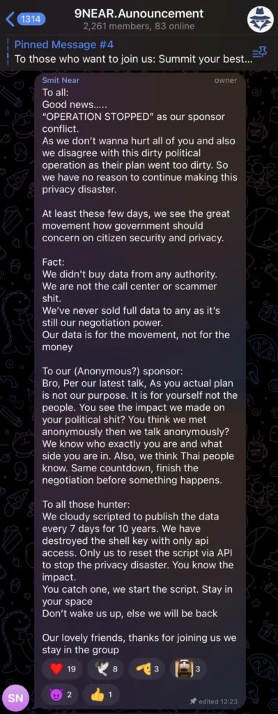 วันที่ 2 เมษายน 2566 มีการประกาศเป้าหมายทางการเมืองและการแถลงยุติปฏิบัติการทางกลุ่มแฮกเกอร์ประกาศผ่านเว็บไซต์ว่าจะยุติปฏิบัติการนี้แล้ว โดยระบุว่า…