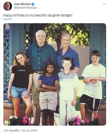 ในช่วงเวลาดังกล่าว จอห์น แม็คเคน ออกเดินทางหาเสียงพร้อมกับสมาชิกในครอบครัว รวมถึง บริดเจ็ต เด็กหญิงชาวบังกลาเทศที่แม็คเคนรับเลี้ยงเป็นบุตรบุญธรรมอย่างถูกกฎหมายมาตั้งแต่ปี 1991