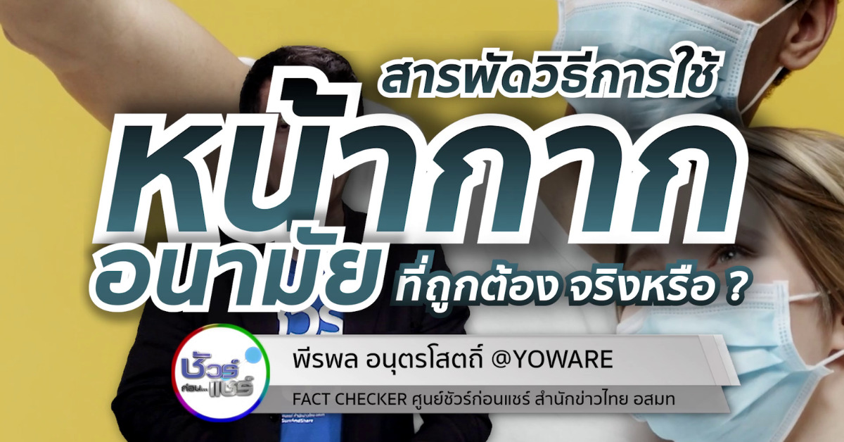 3 พฤษภาคม 2566 – จากกรณีที่มีการแชร์เกี่ยวกับวิธีการใช้หน้ากากอนามัยไว้มากมาย เช่น ห้ามใช้แอลกอฮอล์พ่นหน้ากากอนามัยเพราะจะทำให้เสื่อมประสิทธิภาพ หรือ หน้ากากผ้าที่เราใช้กันนั้นป้องกันโควิด-19 ไม่ได้ เรื่องไหนจริง เรื่องไหนเท็จ พบคำตอบได้ที่ชัวร์ก่อนแชร์ CHECK-LIST ร้อยเรียงเรื่องฮิต ติดอันดับกับชัวร์ก่อนแชร์