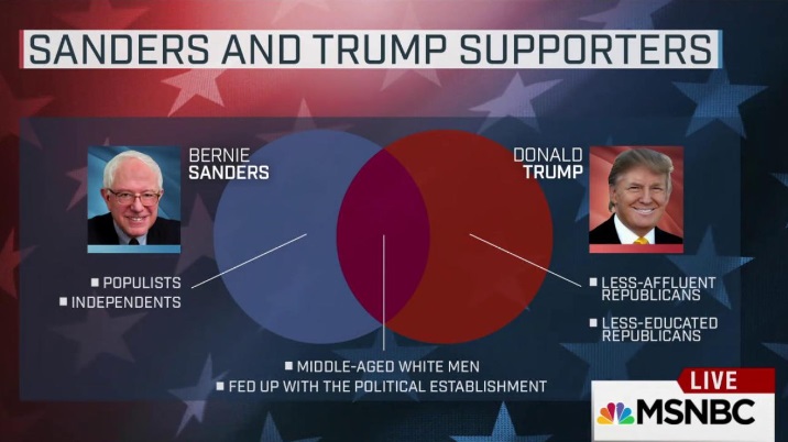 ผลสำรวจพบว่า ระหว่างการเลือกตั้งประธานาธิบดีสหรัฐปี 2016 มีฐานเสียงของ เบอร์นี แซนเดอร์ ถึง 12% ที่กลายเป็น Sanders–Trump voters และมีอีก 12% ที่ถึงแม้ไม่โหวตให้กับ โดนัลด์ ทรัมป์ แต่ก็ไม่โหวตให้กับ ฮิลลารี คลินตัน เช่นเดียวกัน