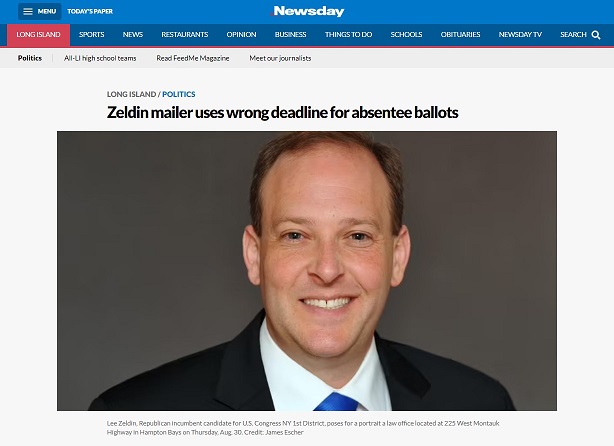 ปี 2018 ก่อนการเลือกตั้งสมาชิกสภาผู้แทนราษฎรสหรัฐเขตลอง ไอแลนด์ รัฐนิวยอร์ก ลี เซลดิน จากพรรครีพับลิกัน ผู้เป็น ส.ส. เขตนี้มาตั้งแต่ปี 2015 ได้ส่งใบปลิวเพื่อเตือนให้ผู้ขอใช้สิทธิ์เลือกตั้งล่วงหน้า (Absentee Ballots) ต้องส่งใบลงคะแนนของตนเองภายในวันที่ 6 พฤศจิกายนซึ่งตรงกับวันเลือกตั้ง