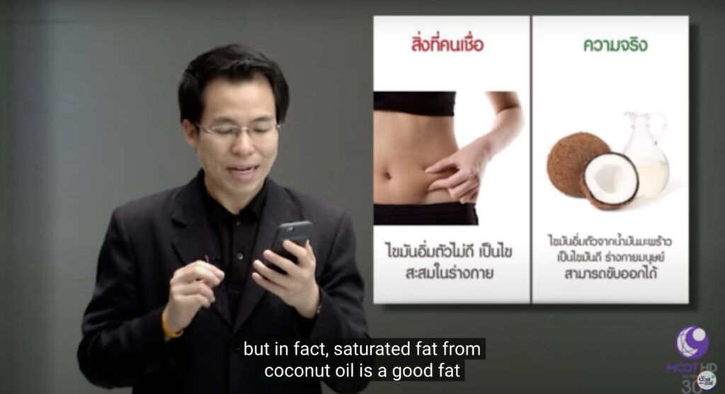 มีการแชร์ถึงสรรพคุณของน้ำมันมะพร้าวว่า ไขมันอิ่มตัวจากน้ำมันมะพร้าวเป็นไขมันดี ร่างกายมนุษย์สามารถขับออกได้ และสิ่งที่คนเชื่อคือการกินไขมันนั้นทำให้อ้วน แต่ความจริง คือ ร่างกายต้องการไขมันในการละลายวิตามิน การกินไขมันจึงเป็นสิ่งจำเป็น