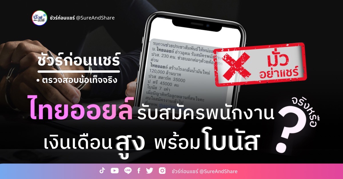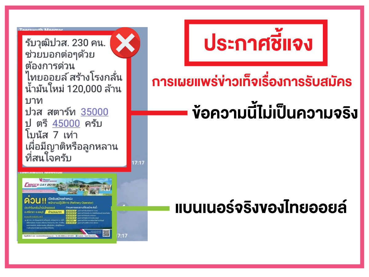 🎯 ตามที่มีการแชร์ประกาศรับสมัครพนักงานบริษัทไทยออยล์ เงินเดือนสูง พร้อมโบนัส นั้น
