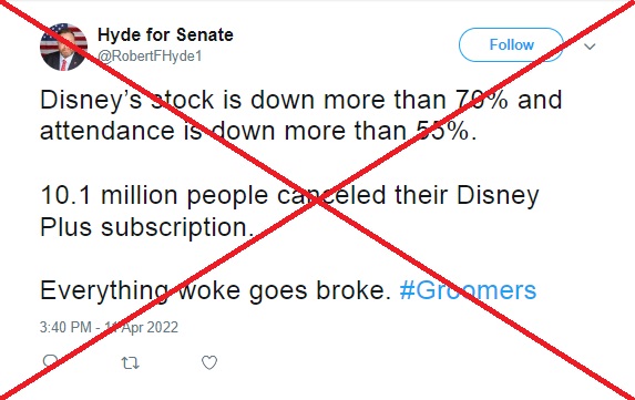 มีข้อมูลบิดเบือนเผยแพร่ทาง Twitter ในสหรัฐอเมริกา เมื่อ โรเบิร์ต ไฮด์ ผู้ลงสมัครรับเลือกตั้งตำแหน่งวุฒิสมาชิกรัฐคอนเนตทิคัต พรรครีพับลิกัน อ้างว่าบริษัท Walt Disney Company ซึ่งกำลังถูกคว่ำบาตรอย่างหนักเพราะการออกตัวต่อต้านกฎหมาย Don’t Say Gay ในรัฐฟลอริดา ส่งผลให้บริษัทเผชิญการถดถอยทางธุรกิจอย่างรุนแรง เมื่อมูลค่าหุ้นลดลงถึง 70% มีสมาชิกยกเลิกบริการสตรีมมิง Disney+ ถึง 10.1 ล้านบัญชี ส่วนจำนวนนักท่องเที่ยวในสวนสนุกก็ลดลงมากกว่า 55% โดยย้ำว่านี่คือบทพิสูจน์แนวคิด Go Woke, Go Broke ที่เชื่อว่าธุรกิจที่สนับสนุนการตื่นรู้ทางสังคม จะพบจุดจบด้วยการล้มละลายทั้งหมด